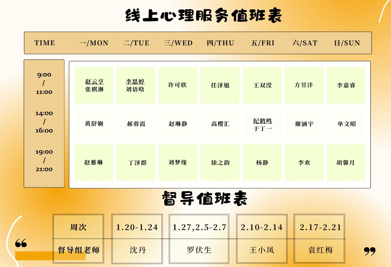 开放时间周全:服务开放时间为2025年1月17日至2月23日,期间虽1月28日至2月4日为法定节假日,但心理服务依旧持续提供,确保学生在整个寒假都能有寻求心理帮助的渠道。