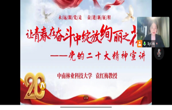11月24日晚,由党的二十大湖南高校教师代表、学工部心理中心袁红梅教授主讲的第四次朋辈辅导课堂同样顺利开展,讲述内容主要为二十大的报告内容及其精神,以及袁红梅教授的二十大经历。在这节课中,袁红梅教授细致的介绍了二十大报告的主要内容与精神,让同学们感受到其中所蕴含的深意,同时,袁红梅教授还进一步向同学们传递了作为新时代中国青年应当用使命与担当谱写时代华章这一重要信念。