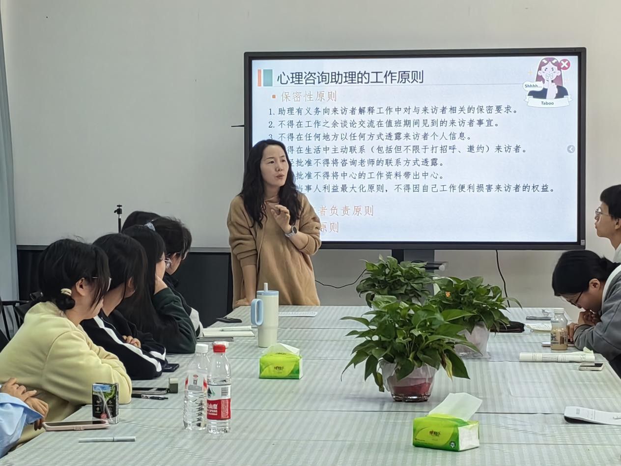 为进一步提升心理咨询助理的专业素养与服务能力,筑牢校园心理健康服务防线,11月11日,心理健康中心组织开展心理咨询助理工作技能培训,中心专职教师李思婷老师担任主讲。