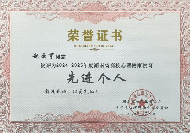 会议期间,发布表彰通报(湘大心专〔2025〕05号),我校心理健康教育工作成果丰硕,斩获三项荣誉。心理中心荣获“2024—2025年度湖南省高校心理健康教育先进集体”称号,中心教师赵云亨被评为“先进个人”,学生心理委员联合会获评“优秀心理类学生社团”。