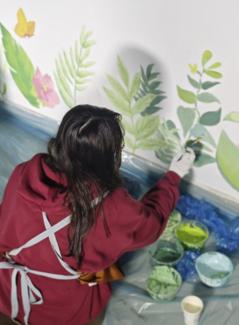 在我中心“差序共生”心育森林生态理念的引导下,参与绘制的学生团队深度契合心理服务需求,力求打破传统心理空间“严肃刻板”的固有印象。他们希望通过贴近自然的艺术表达,缓解来访者的紧张情绪,让墙面成为传递温暖的“无声载体”,让环境发挥潜移默化的“治愈效能”。“我们不想画得太‘满’,而是刻意留出呼吸感。”一位参与设计的同学说道,“这正是契合了心理健康教育中心倡导的心理成长理念——心理疗愈需要空间,需要耐心,更需要借助自然意象传递温暖与力量。”