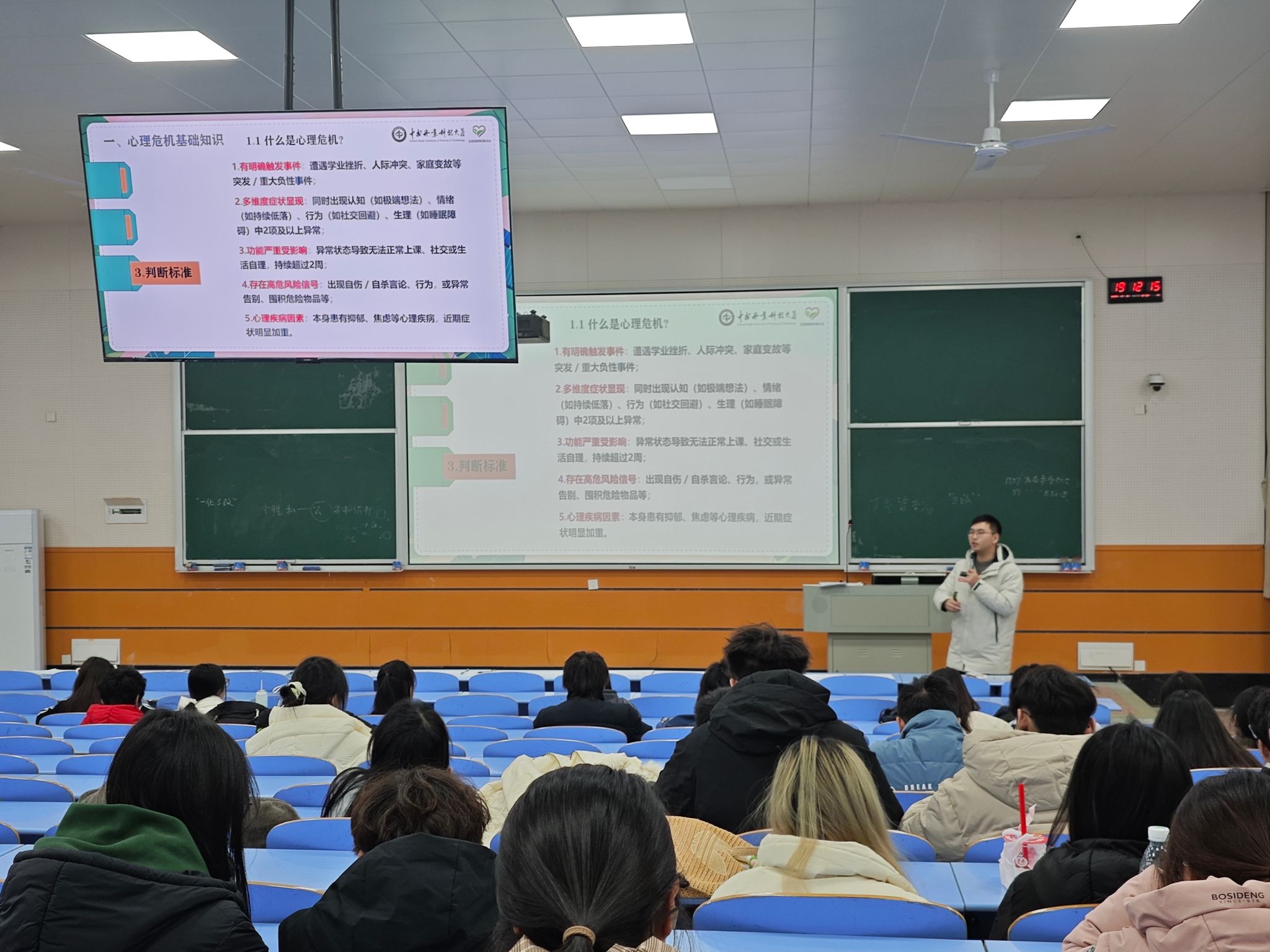 为充分发挥学生主体地位和能动作用,进一步提升心理危机识别与预警能力,构建全方位心理健康防护网络,心理健康教育中心于12月15日晚在树木楼003教室举办“心林伙伴”志愿者第二期培训。本次培训由中心专职心理教师纪鹤鸣主讲,全校近200名志愿者参与培训。