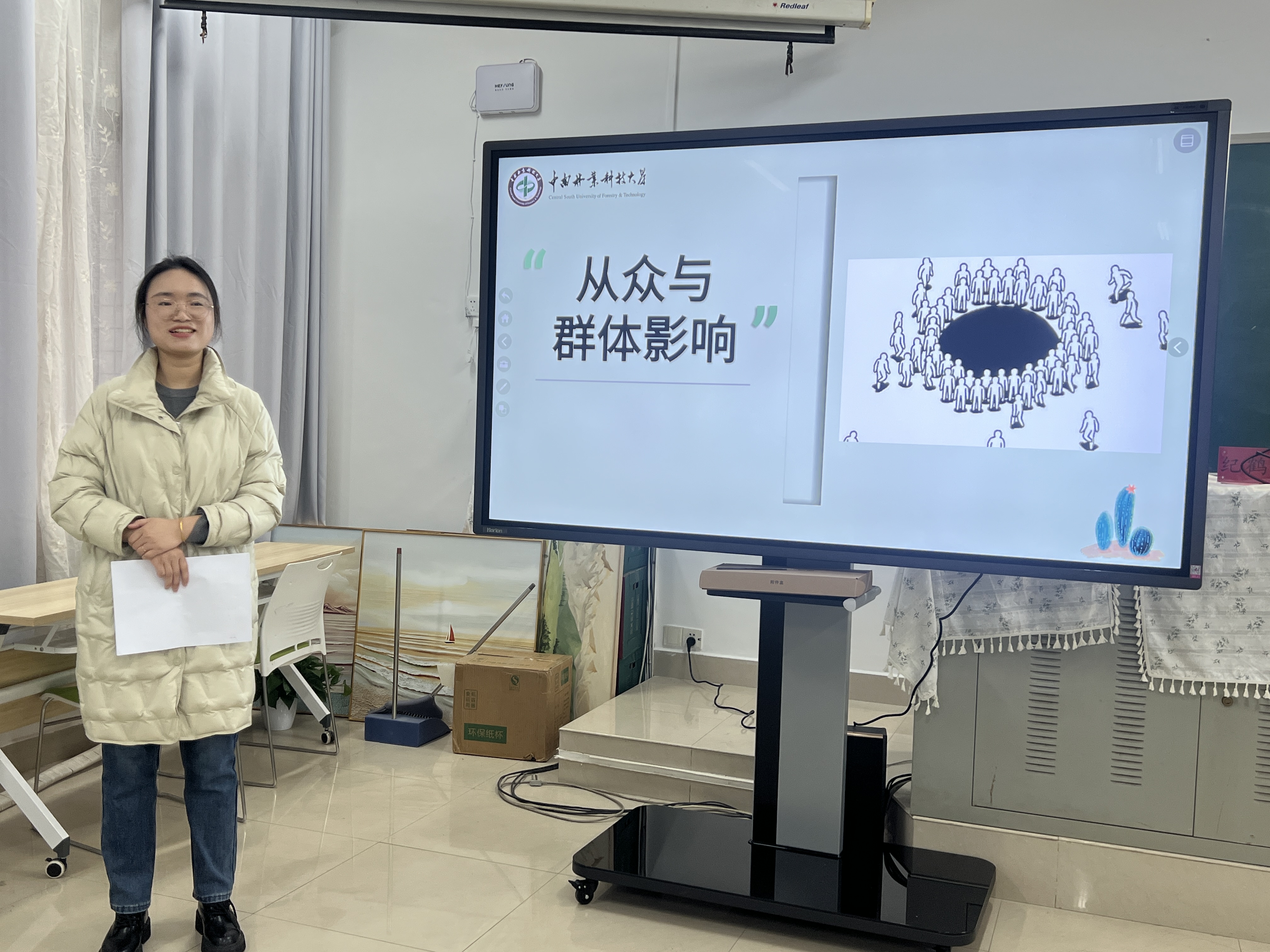 12月5日上午,心理健康教育教研室在德润楼607开展本学期的第十次集体备课。本次集体备课的主题为“从众心理与群体效应”,由兼职教师刘宇老师主讲。